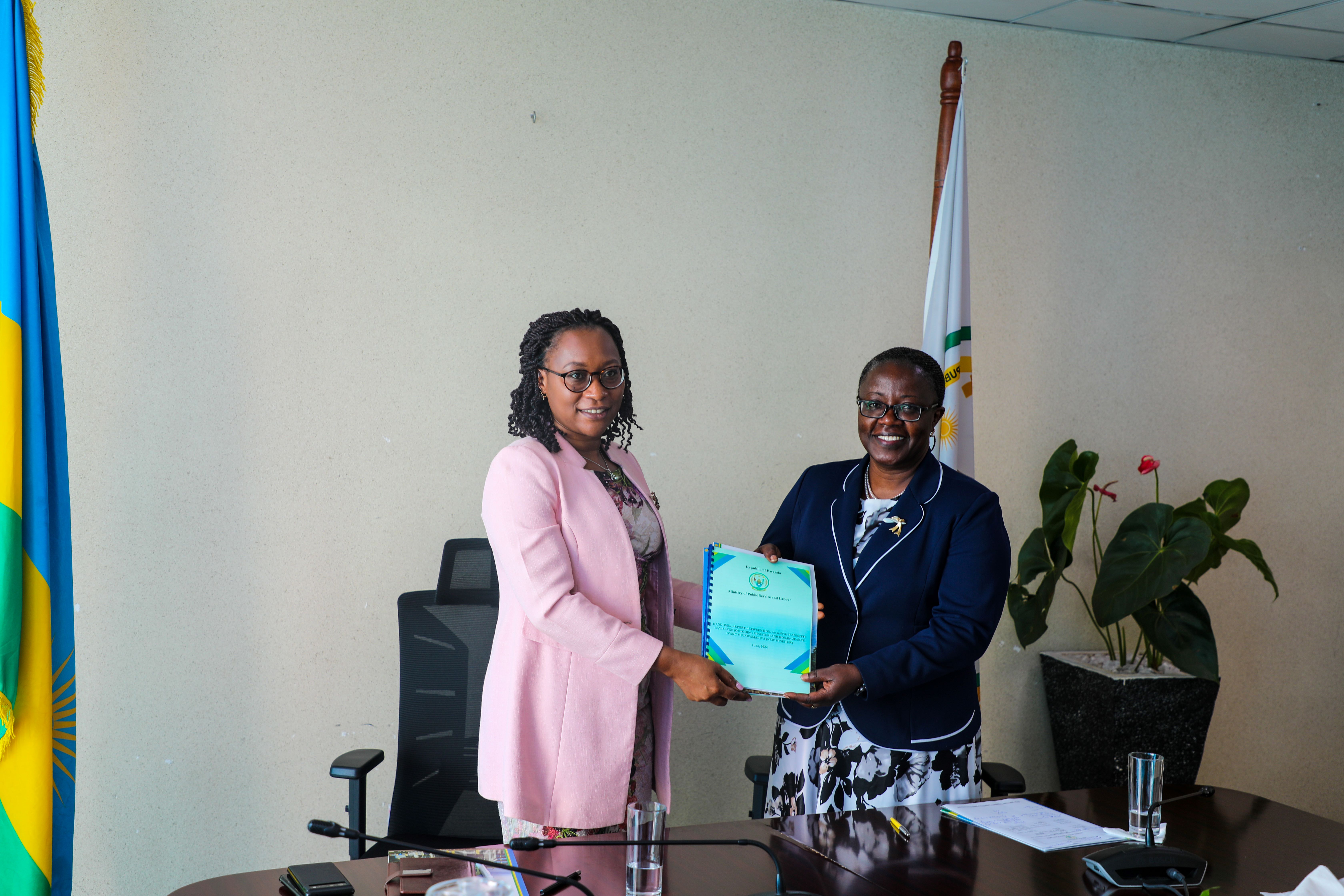 On Friday, 14 June 2024, at the Ministry of Public Service and Labour Headquarters, a handover ceremony took place between the outgoing Minister, Assoc. Prof. Bayisenge Jeannette, and the incoming Minister, Dr. Jeanne d’Arc Mujawamariya.