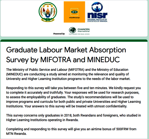 Kindly take part in the employment survey by filling out the form via this link: https://docs.google.com/forms/d/e/1FAIpQLSdoSnmbc4PS3mEq5hh3MOgd4CCcSDz_cWiGAhQzjrud_SfP9Q/viewform or by dialing *520#, then win 500 FRW MTN airtime.